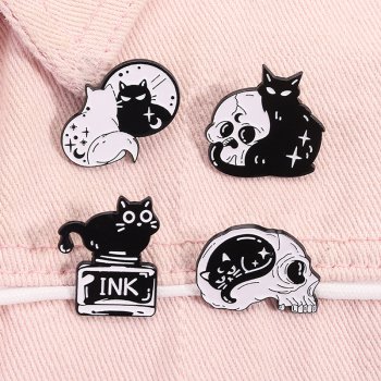 Gothic Black Cat Skull Moon Enamel Pin – Witchy Halloween Lapel Brooch